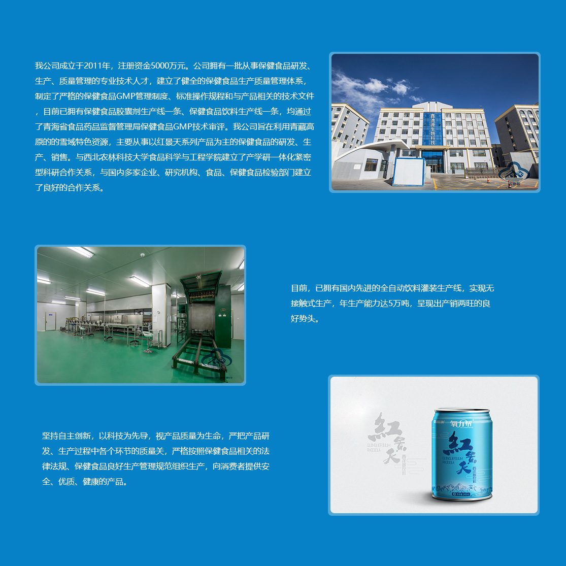青海鑫池源生物科技開發(fā)有限公司2011年3月29日在青海生物科技產(chǎn)業(yè)園區(qū)工商行政管理分局登記成立,注冊(cè)資金5000萬(wàn)元。         鑫池源公司立足于青海省綠色環(huán)保無(wú)污染的高品質(zhì)紅景天資源,以西北農(nóng)林科技大學(xué)食品科學(xué)與工程學(xué)院和青海格拉丹東藥業(yè)有限公司為技術(shù)依托,主要從事紅景天、紅枸杞、黑枸杞等高原生態(tài)植物資源的研究開發(fā)和深加工,產(chǎn)品包括“景胨”牌紅景天西洋參保健飲品、紅景天口服液、紅景天膠囊等系列產(chǎn)品。         公司擁有一批從事保健食品研發(fā)、生產(chǎn)、質(zhì)量管理的專業(yè)技術(shù)人才,建立了健全的保健食品生產(chǎn)質(zhì)量管理體系,制定了嚴(yán)格的保健食品GMP管理制度、標(biāo)準(zhǔn)操作規(guī)程和與產(chǎn)品相關(guān)的技術(shù)文件,目前已擁有保健食品膠囊劑生...